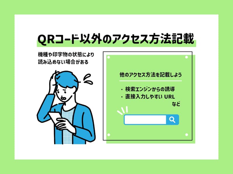 QRコードリーダーがついていない一部の古いモバイル端末を使用している人はアクセスすることはできません。また、QRコード付き端末を使用しても、チラシの状態などによって正しく読み取ることができないケースもあります。「申し込み」などアクションに誘導する重要な経路の場合は、他のアクセス手段も用意しておくと安心です。