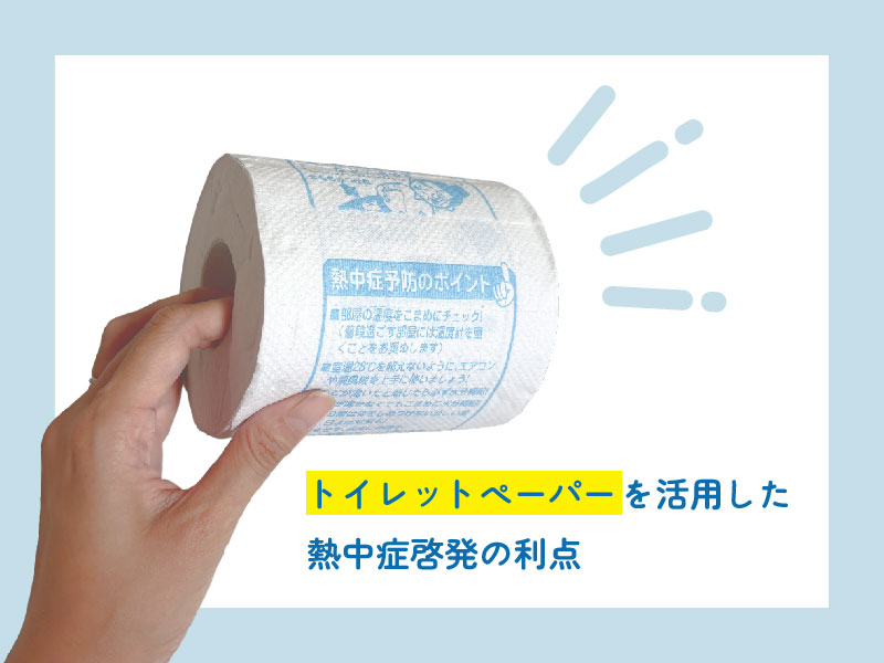 といった特徴があります。トイレットペーパーを使った啓発は、熱中症対策のパンフレット、ポスターなどの「見るだけの啓発」とは異なり、生活の中で啓発内容が自然に届きます。